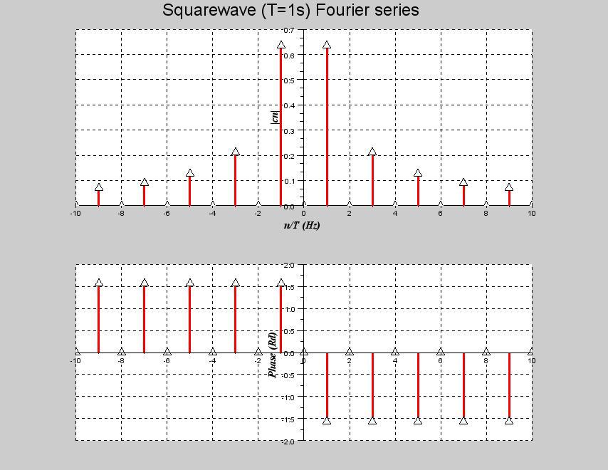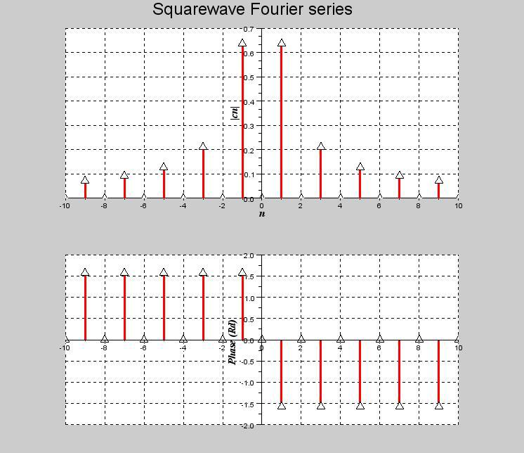 On peut représenter graphiquement les coefficients \(c_n\) par deux graphiques, le premier est le module de \(c_n\) et le second l'argument de \(c_n\). En abscisses on a la valeur de n qui varie de \(-\infty\)à \(+\infty\). L'argument s'expriment en radian.